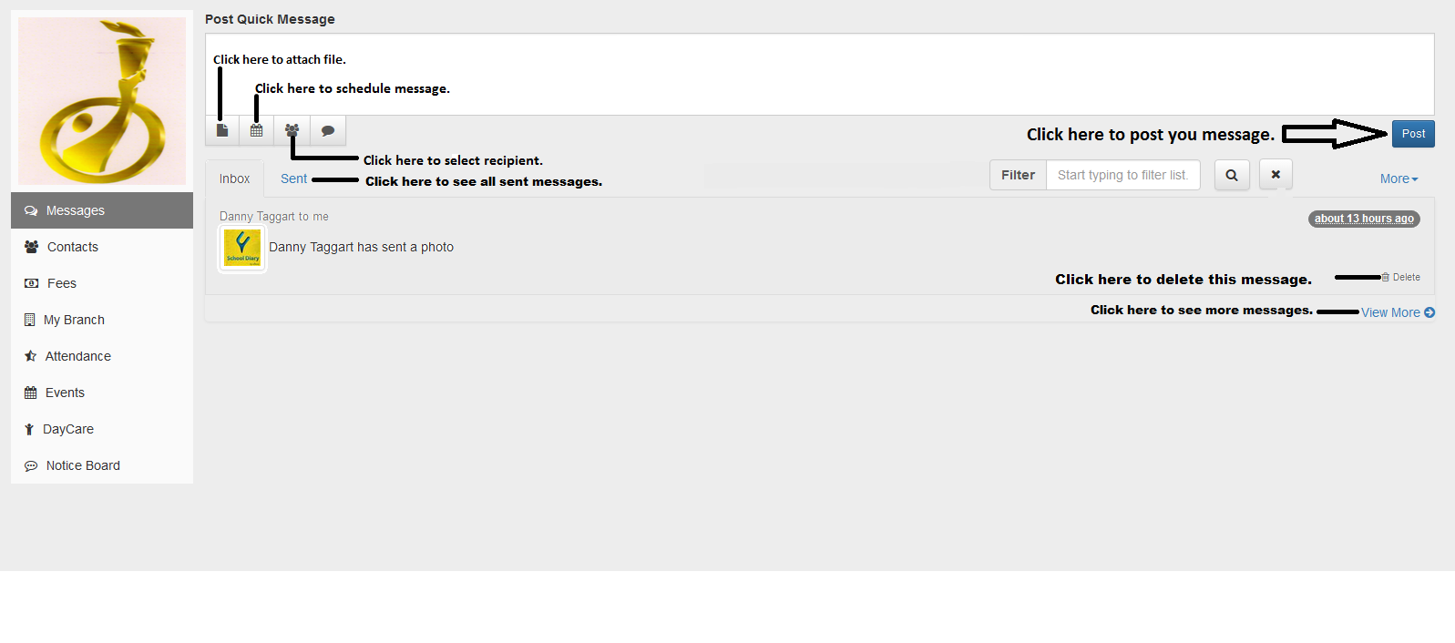 By using 'Messages' link from the Administrative section under My branch tab you can view all messages received and sent by each school staff.